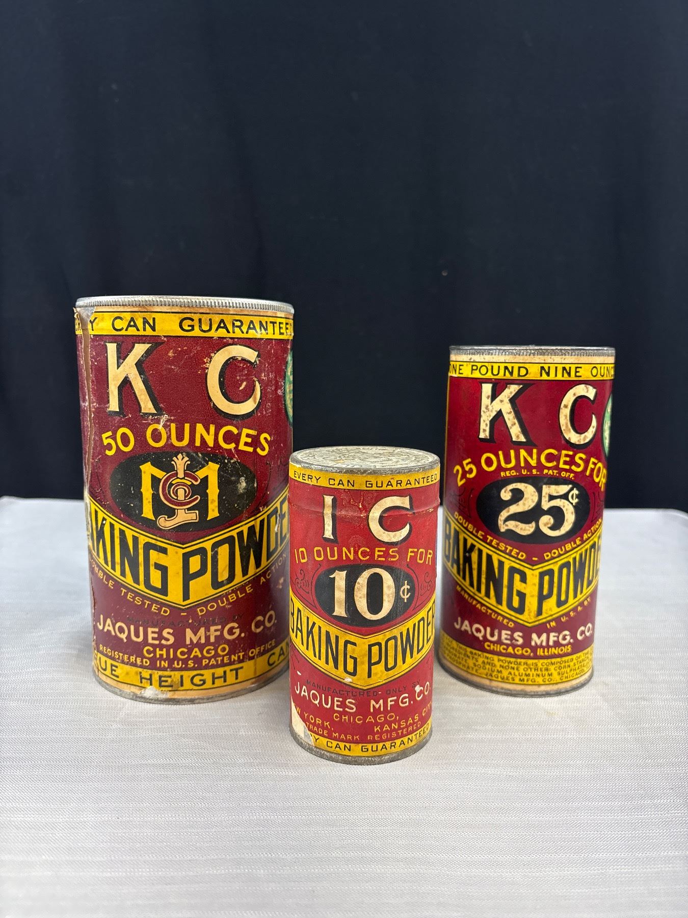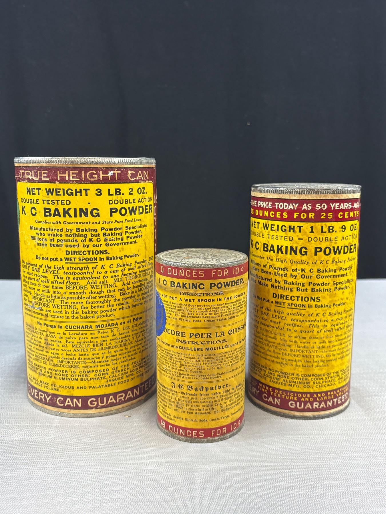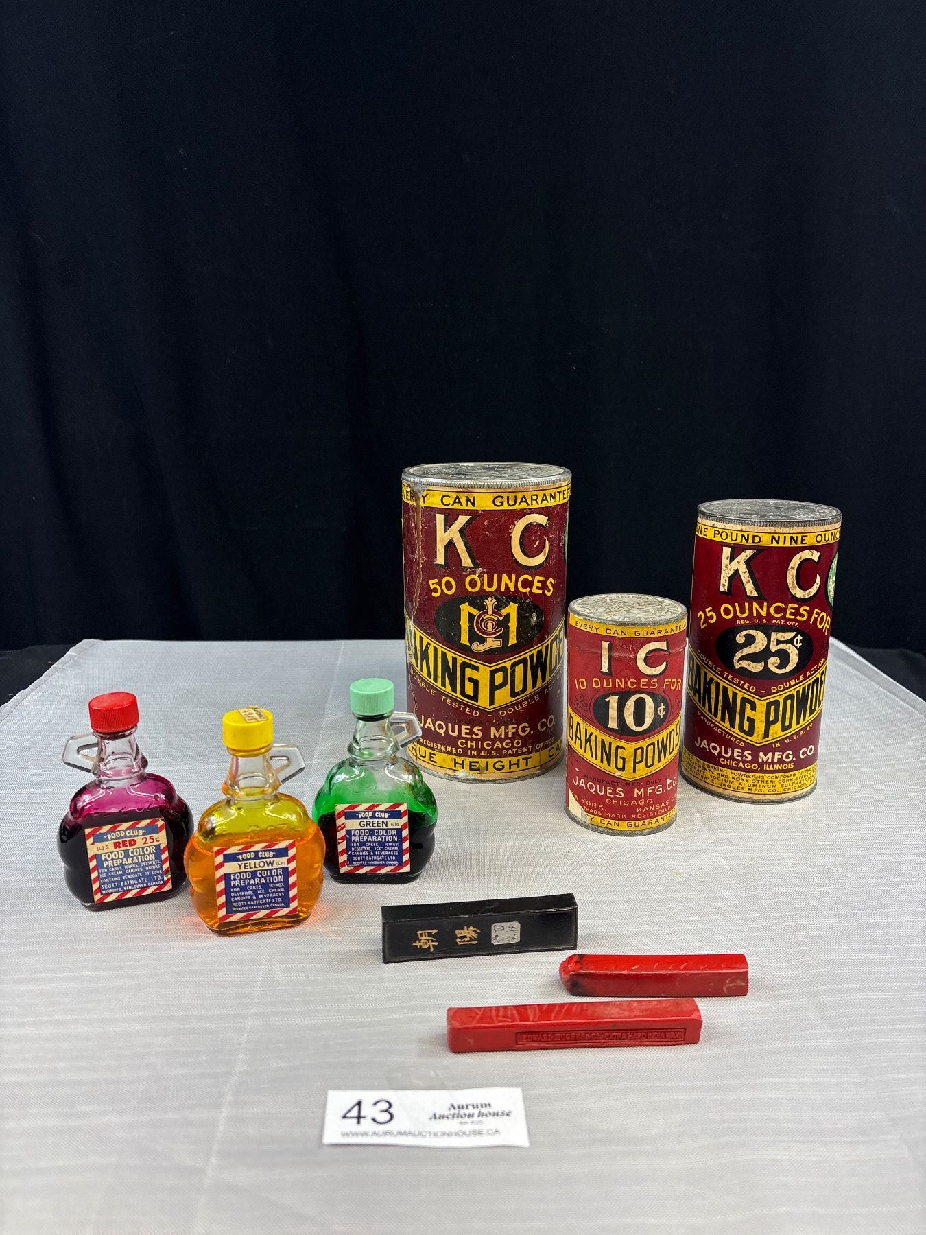 Lot of 3 King Powder Baking Powder Tins Full + Food Club Dyes and Chinese Wax Seals