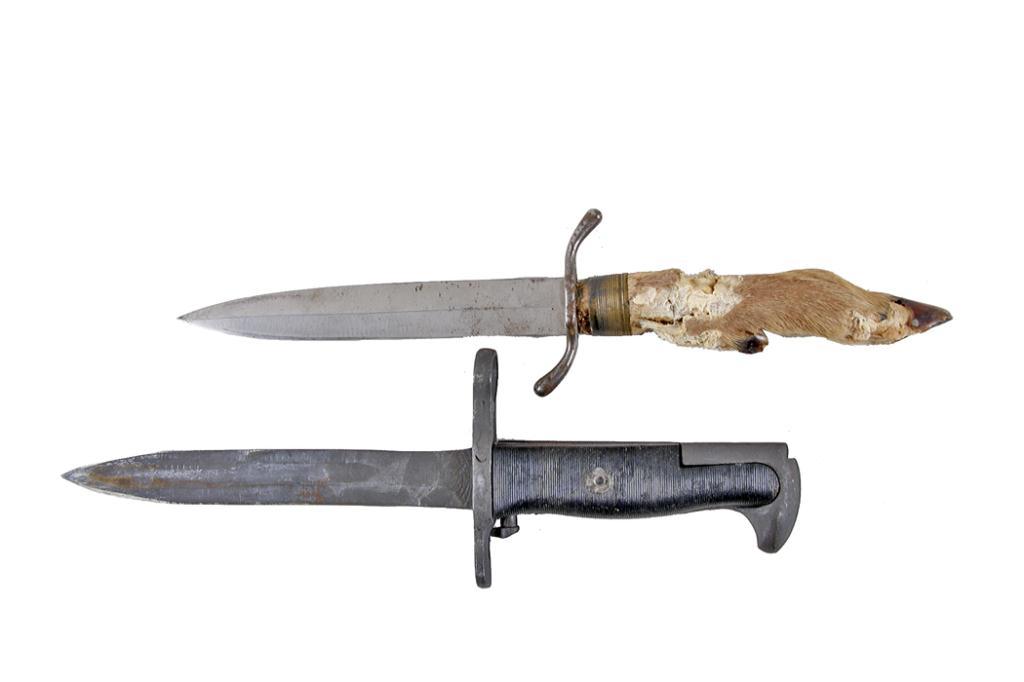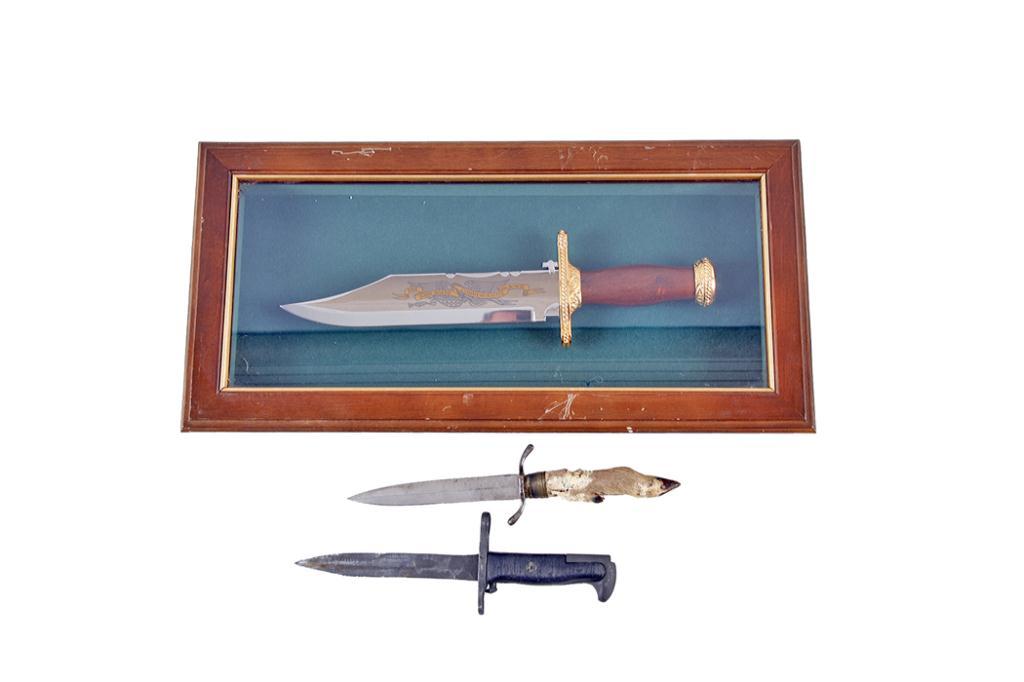 Lot of 3 Knives Including 1 John Wayne Commemorative knife in a shadowbox, 1 small Wadsworth & Sons dagger with deer hoof handle, and 1 small bayonet.Including 1 John Wayne Commemorative knife in a shadowbox, 1 small Wadsworth & Sons dagger with deer hoof handle, and 1 small bayonet.