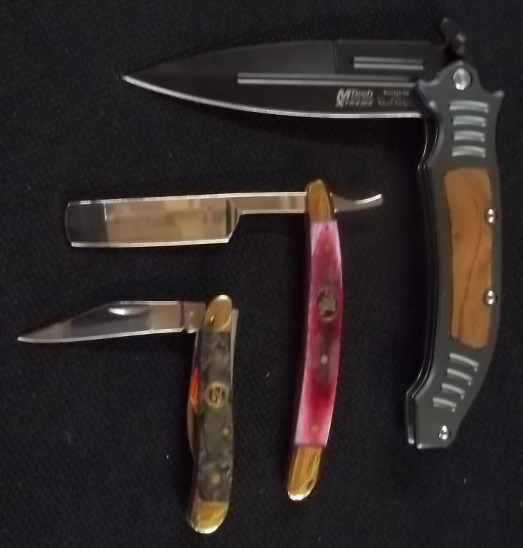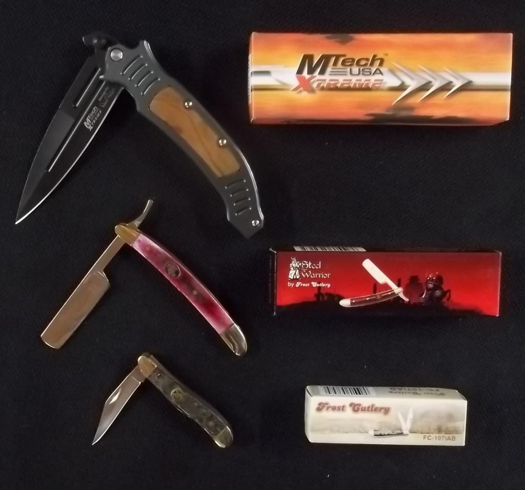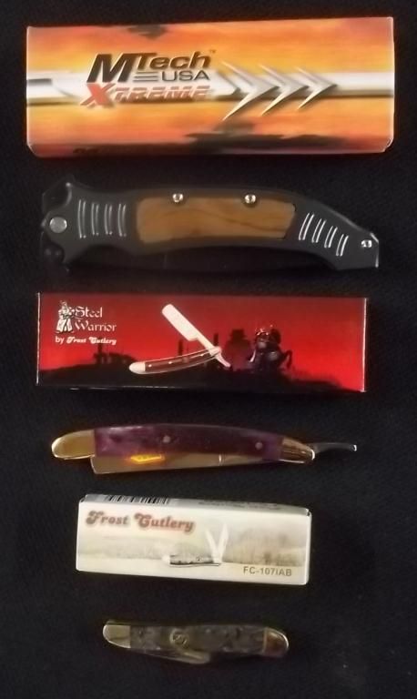 M-Tech Wood handled Thumb Assisted Opening Knife. Steel Warrior 4 inch Closed Little Razor with Purple Smooth Bone Handle. Frost Cutlery Little Peanut with Abalone Handle and Stainless Steel Blades