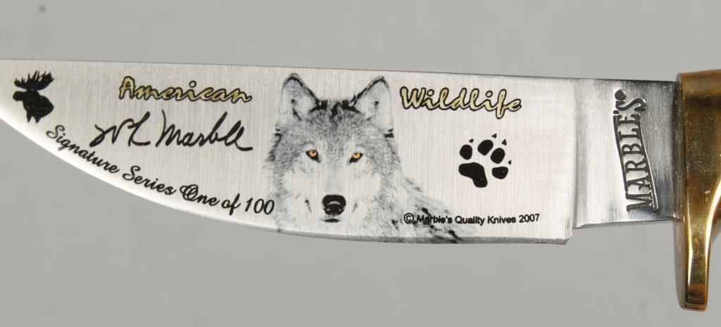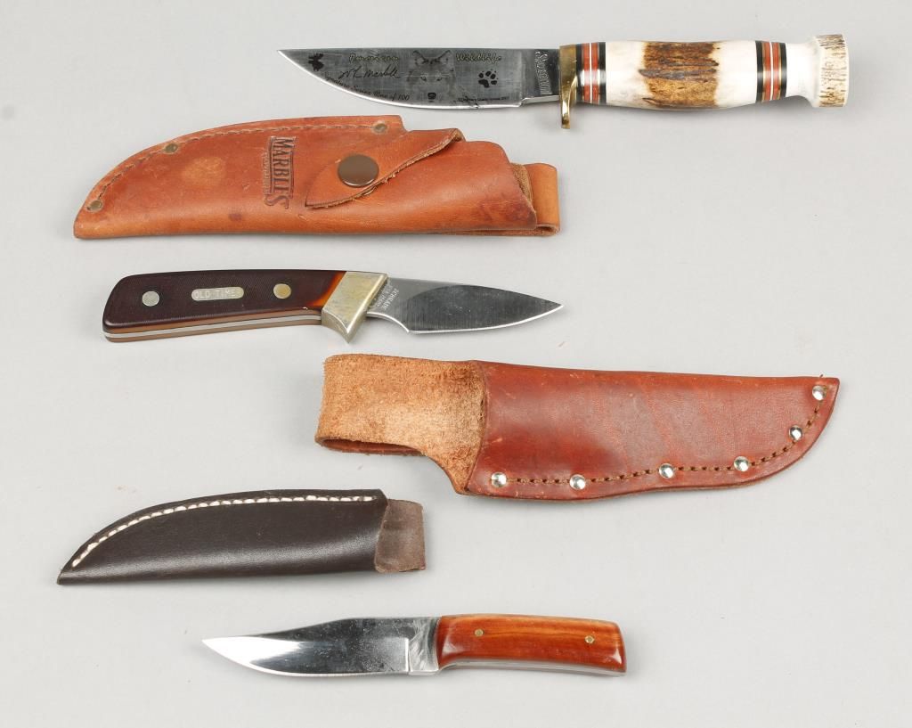 Including: Old Timer, small skinner 7" overall 3" blade with leather sheath; 1 handmade knife with wood handle 6-1/2" overall 3-1/2 " blade with leather scabbard; 1 Marbles American Wildlife Signature Series 1/100 9" overall 4-1/2" blade brass guard, stag handle, with leather scabbard.