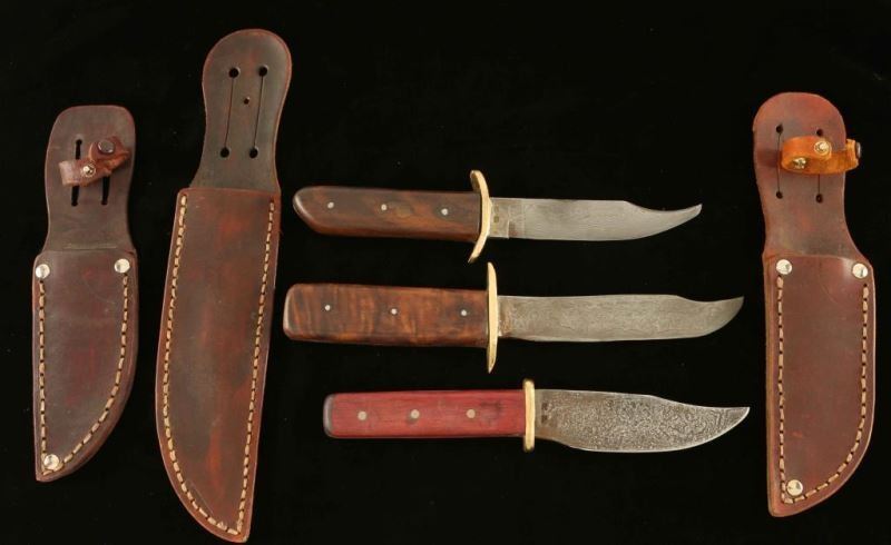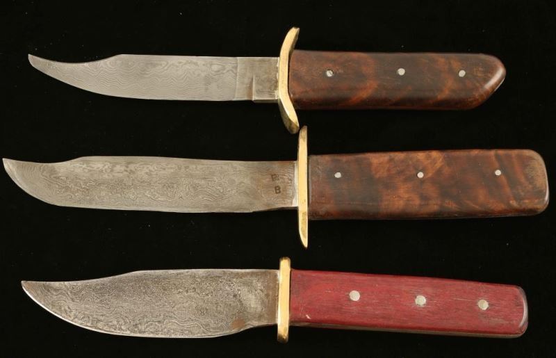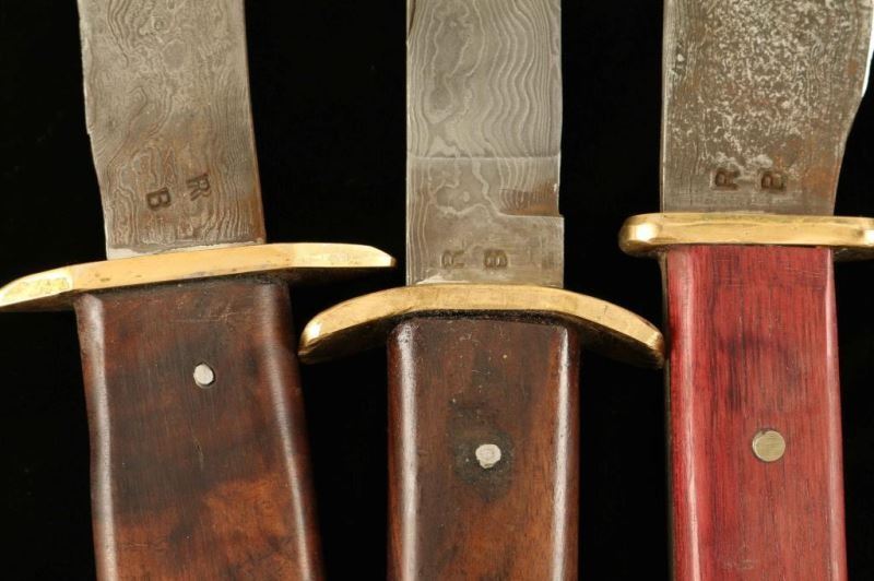 All by "RB" with damascus blades and wood handles and brown leather sheaths.(1) 101/2"overall with 5 " blade(1)91/2"with a 4"blade(1) 91/2" with 5" blade".