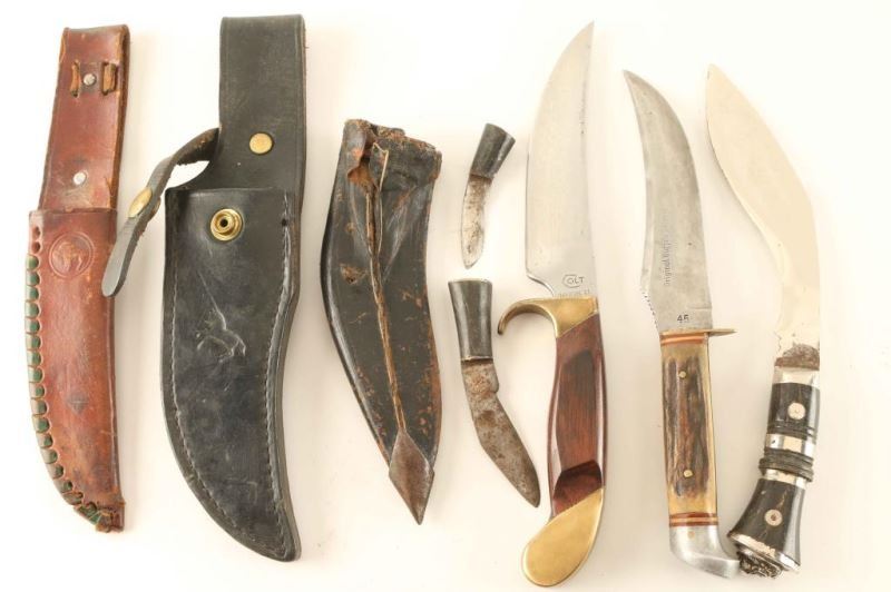 Colt Knife wood handle 10" overall with 6"blade includes sheath, Indian knife with two other small knives 9"overall with a 6"blade, Original Buffalo Skinner antler handle 9"overall with a 5"blade includes sheath.