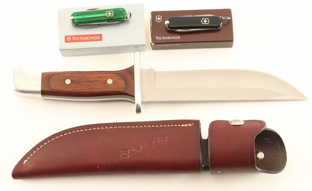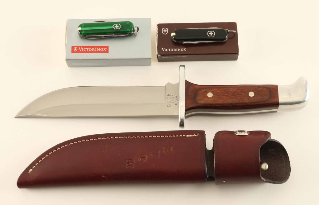 (1) Buck Knife with wood handle marked124 / U.S.A., blade measures 6 1/2" and handle measures 5 1/2" comes in a brown leather scabbard with snap closure and tooled into the front is "BUCK', this set looks new. (1) Victorinox Swiss Army knife new in box, made in Switzerland, black with "Witco" on one side, measures approx 2 1/2" and includes tweezers, toothpick, nail file, knife, scissors and includes a black pouch. (1) Victorinox Swiss Army knife new in box, translucent green (Rogue-Emerald) and includes knife, scissors, bottle opener, flathead screw driver, nail file, toothpick and tweezers.