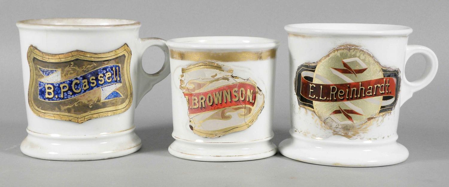 Lot of Three Label Under Glass Personal Shaving Mugs. Fair to Good condition.