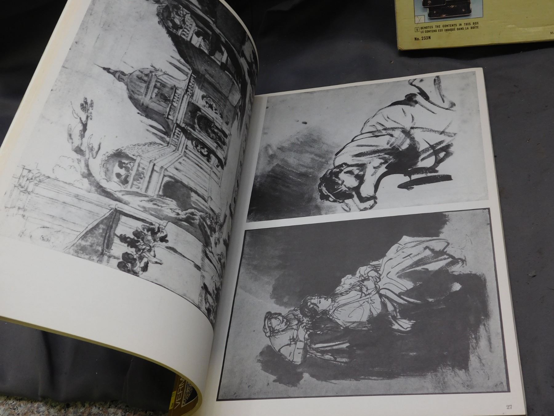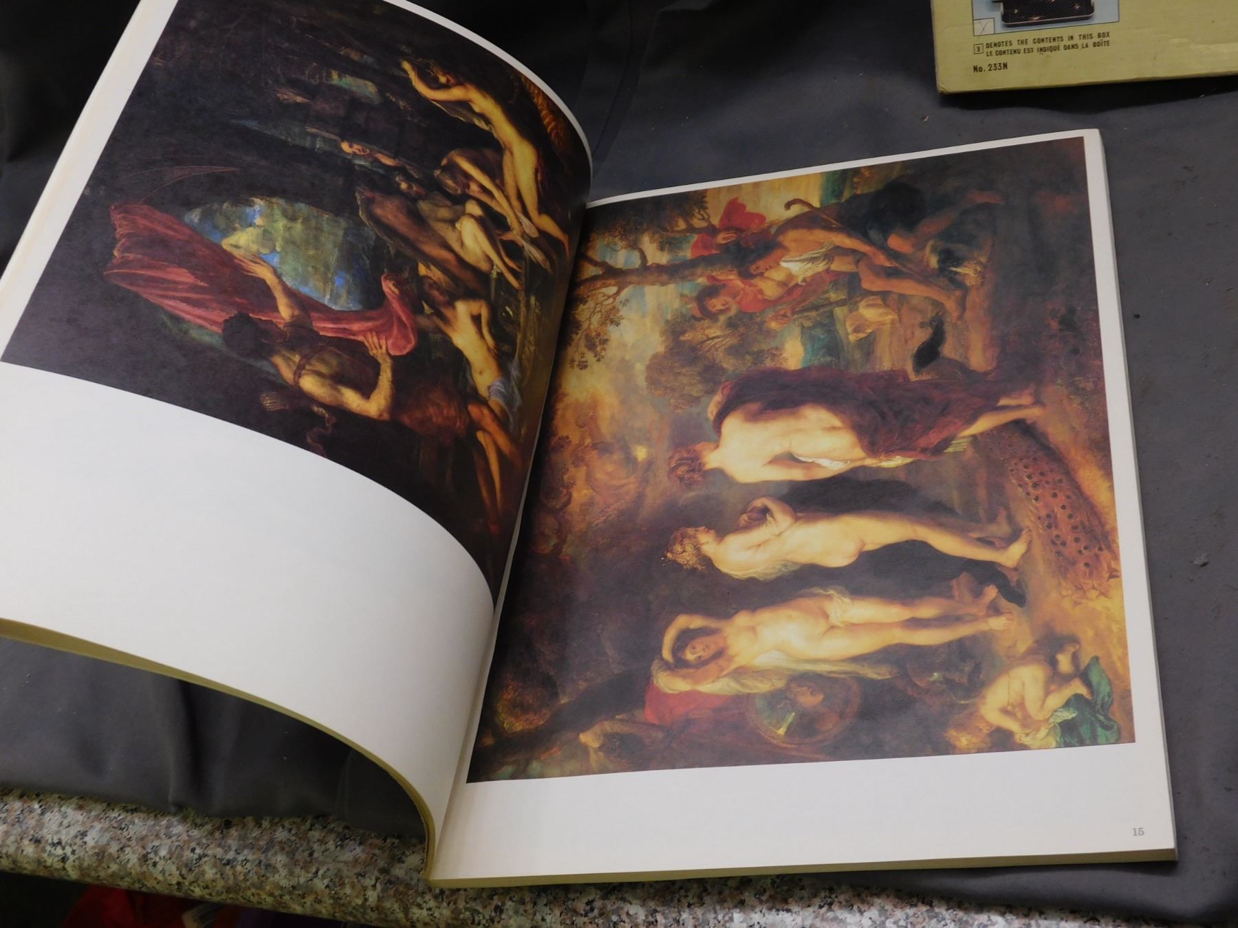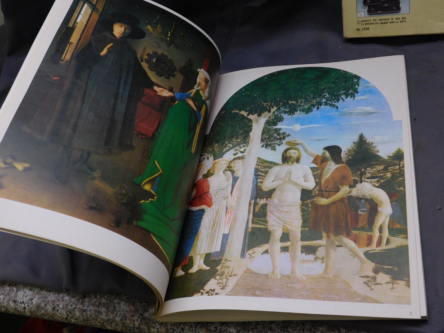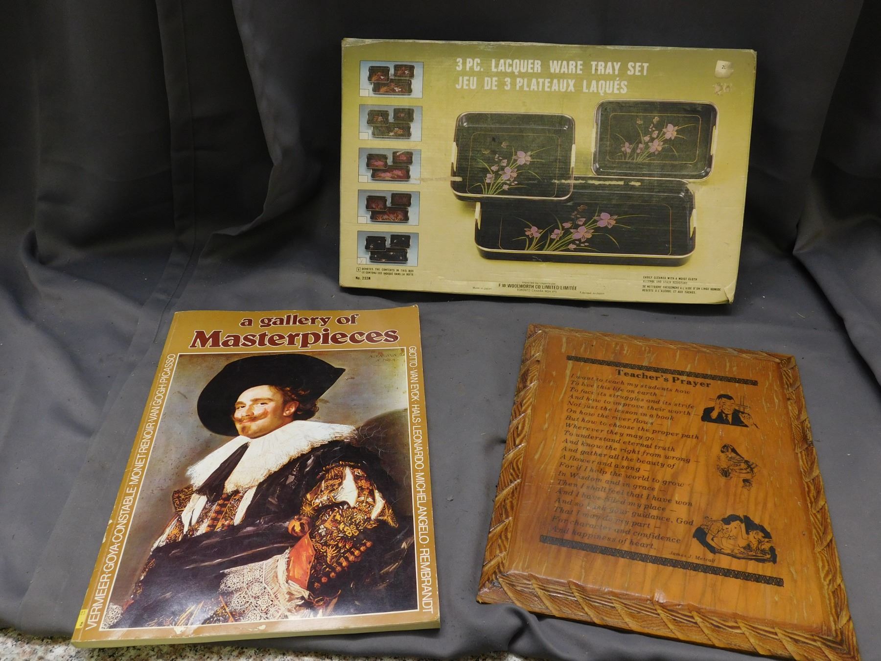 Lot of 3 Lacquer Ware Tray Set, Paperback Gallery of Masterpieces and Wooden Wall Prayer Plaque