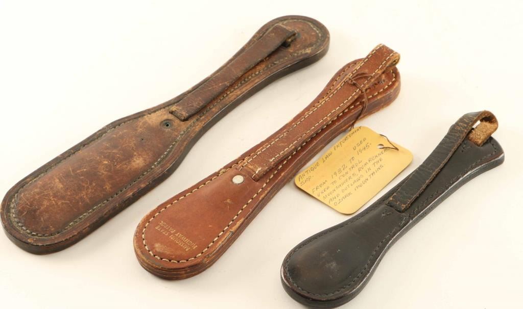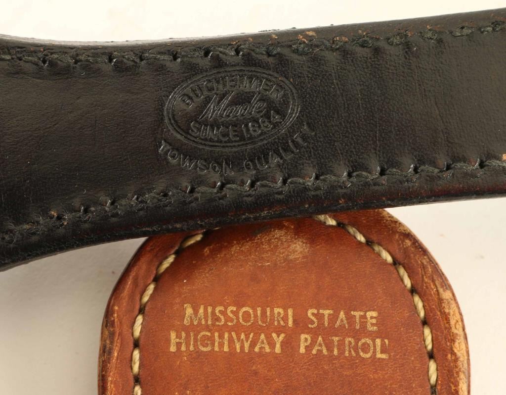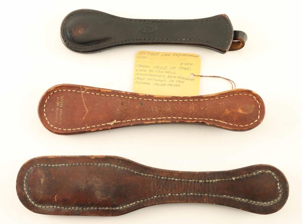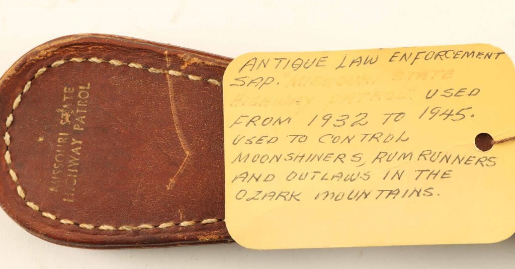 A sap is a flat, beavertail-shaped leather impact weapon that is weighted with lead on at least one end. Higher quality saps have semi-flexible spring steel running the full internal length of the weapon. Saps are very portable and inconspicuous.(1) is marked Missouri State HWY Patrol and (1) other is marked Buckeimer. From Arizona collector Don Fortney Sr.