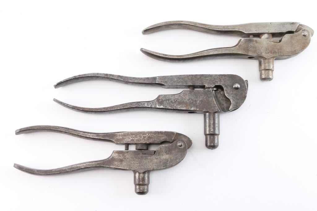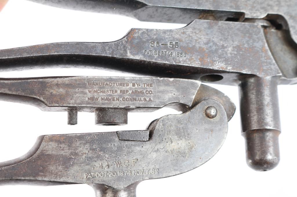 A. Model 1886 Winchester 38-55 caliber, good with minor erosion and pitting. Good markings. B. Model 1886 Winchester 44-40 caliber, fair to good - minor pitting, good markings. C. Model 1886 Winchester 25-20 caliber. Legible markings. Pitted and clean to gray. Fair only. No de capping pins included.