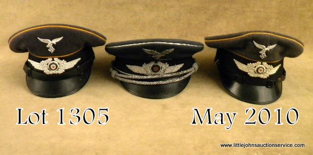 Lot of 3 Luftwaffe visor caps; Two are for a flight NCO, One is an officer’s. All caps retain original insignia and chin straps. Good to very good condition. Est: $600 - $1,200