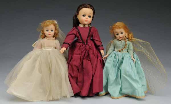 Description American, Ca. 1950s. Lissy-faced Marme, all original in tagged dress and excellent; Cissette bride, all original in tagged outfit, hair a little mussed, face pale; Walt Disney Sleeping Beauty in tagged dress. Extra pink taffeta dress. Condition (Very Good - Excellent). Size Largest: 12" T.