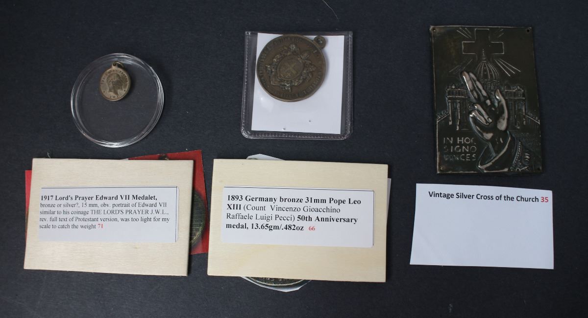 Lot of 3 rare: 1893 Germany bronze 31mm Pope Leo XIII (Count Vincenzo Gioacchino Raffaele Luigi Pecci) 50th Anniversary medal with bail, 13.65gm / .482oz AND 1917 Lord's Prayer Edward VII medalet, 15mm (full text Protestant version) AND Catholic Action vinatage silver plaquette IN HOC SIGNO VINCES Cross of Church (reverse has prayer)