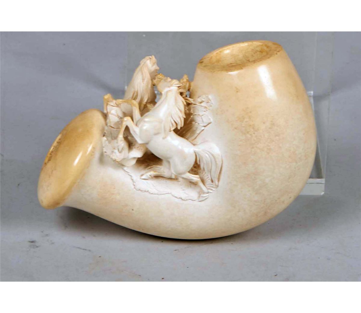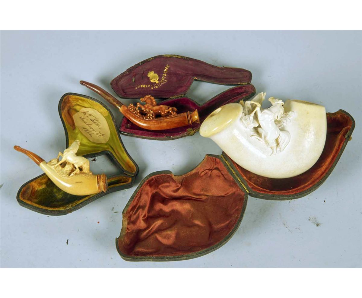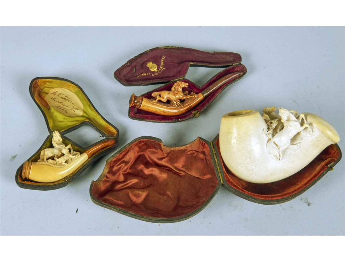 Lot includes: two horses with foliage pipe bowl, a horse with dog pipe in case with handwritten paper label marked "C.T. Stone, Windsor, VT 1866", a running horse pipe in case marked "Sommer & Hlawatschek, Firenze". Shows some wear from age. Condition (Ex