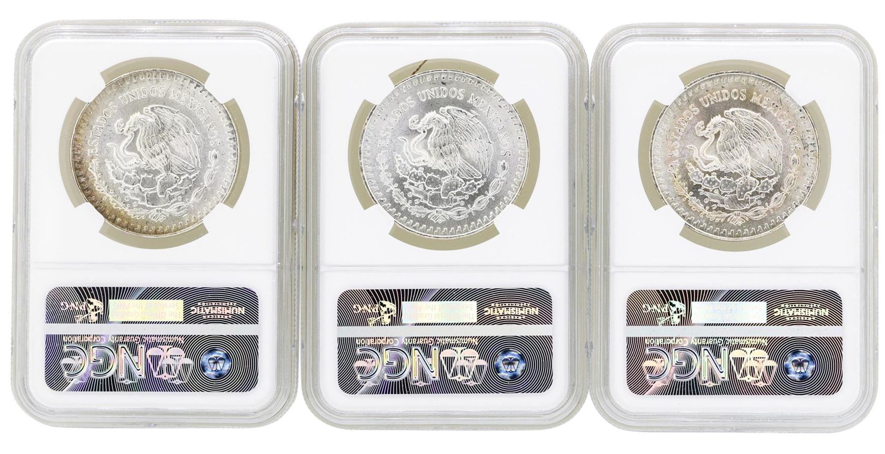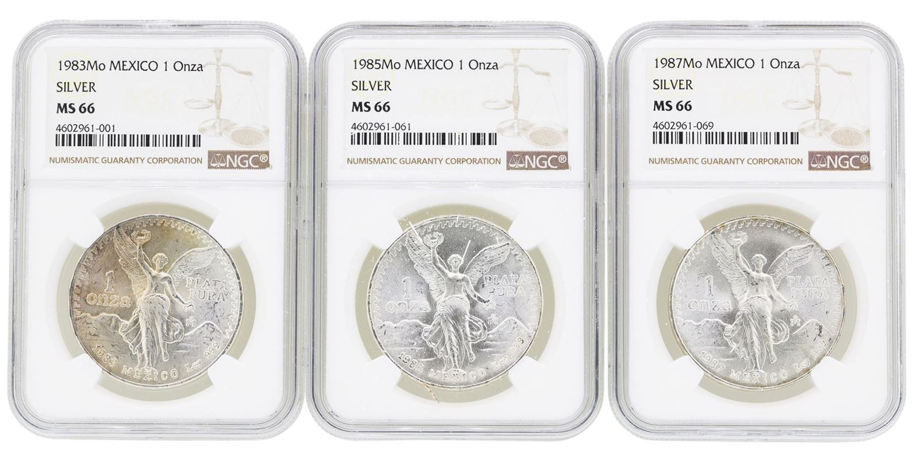 One Lot of (3) Mexico 1 Onza Silver Libertad Coins NGC MS66. NGC Certified.