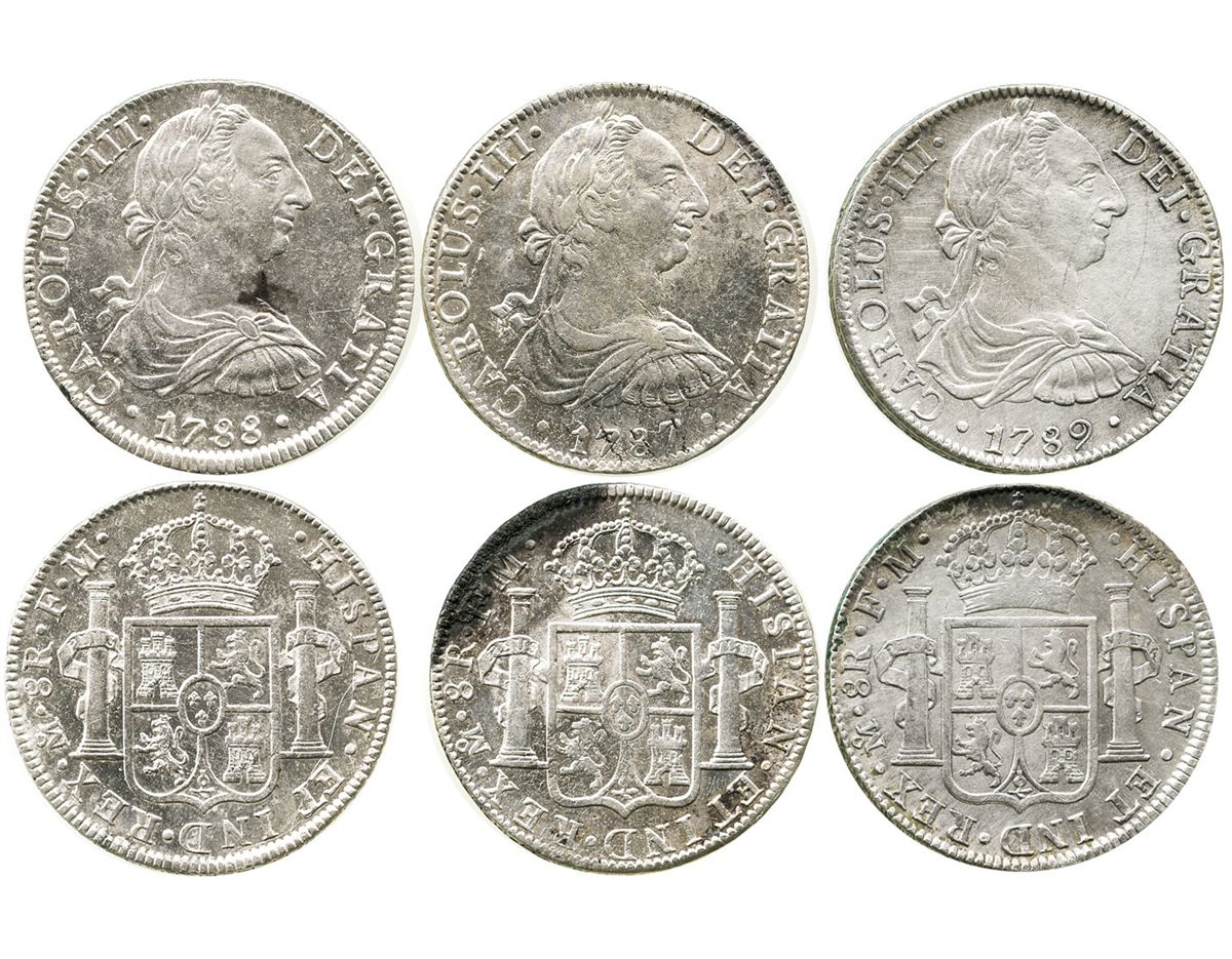 Lot of 3 Mexico City, Mexico, bust 8 reales of Charles III (1787FM, 1788FM and 1789FM) all UNC with spots. KM-106.2a. 80.5 grams total. Lustrous UNC with some dark spots and hairlines, otherwise problem-free.