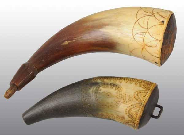 Description Lot includes two small priming horns and one powder horn. Condition (Good). Size Largest: 5 - 1/2" L.