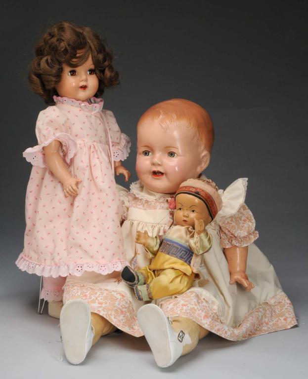 Description Largest is a composition flange neck baby doll, sometimes called mama doll, with sleep eyes, composition lower arms, legs, and cloth torso. When moved up and down the doll cries. Also includes a flange neck composition sleep-eyed girl doll with composition torso and separately jointed arms and legs. Last is a small Japanese composition baby doll wearing original clothes and all four fingers on the left hand are missing. Condition (Fair - Good). Size 23" T.