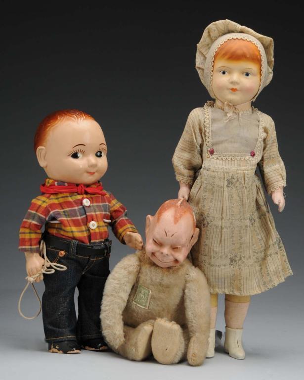 Description Largest is an unmarked girl with composition head, hands, and molded boots wearing original clothes. Also includes a Buddy Lee doll advertising doll for Lee Jeans and a Billiken doll with composition head and five-piece teddy-bear-type body. Condition (Good - Very Good). Size Largest: 17" T.