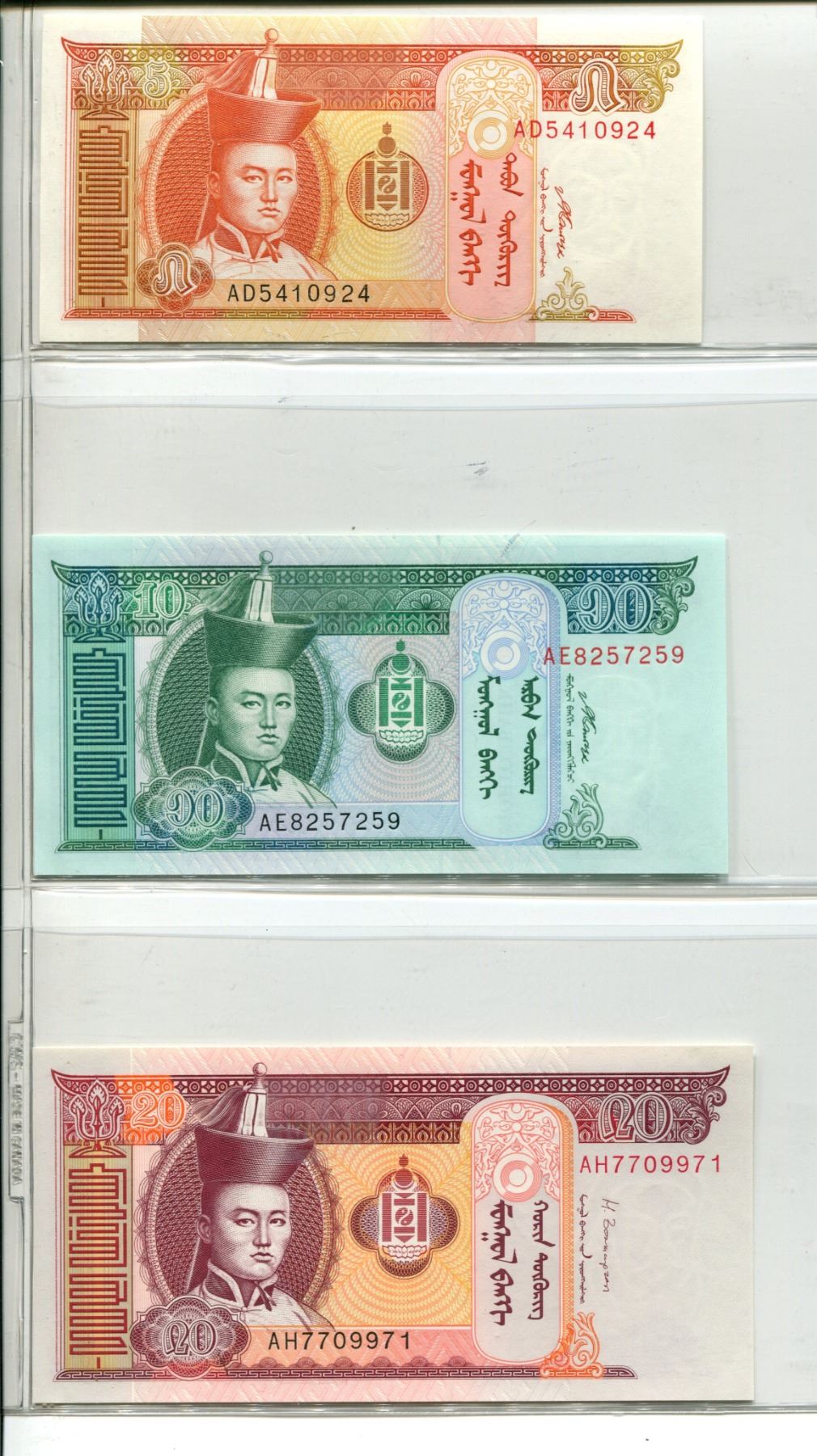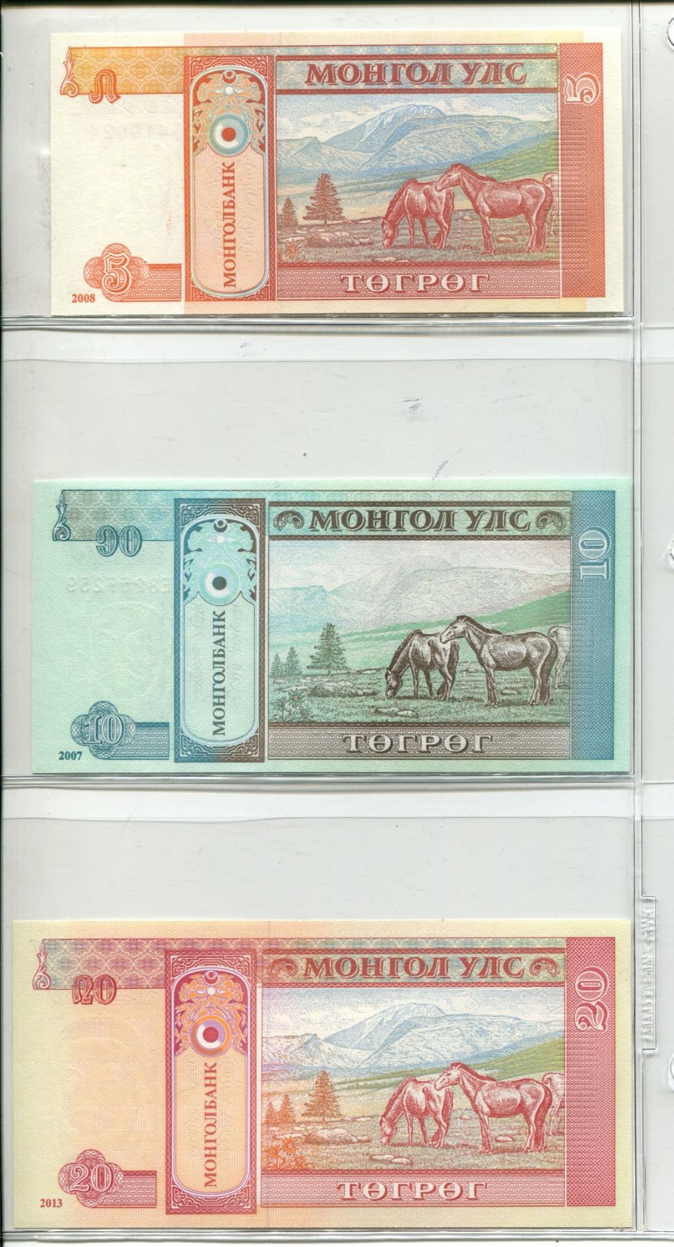 Lot of 3 Mongolia notes. 2008 5 Mongo, 2007 10 Mongo & 2013 20 Mongo. Gem Unc.