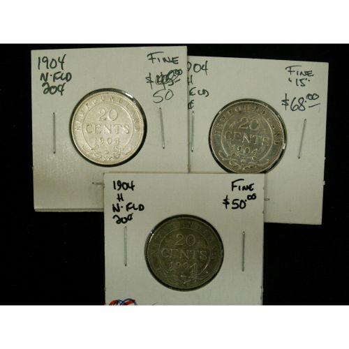 Lot of 3 NFLD 20¢, Includes 1904H Fine(2),1904H Fine-15 (1),
