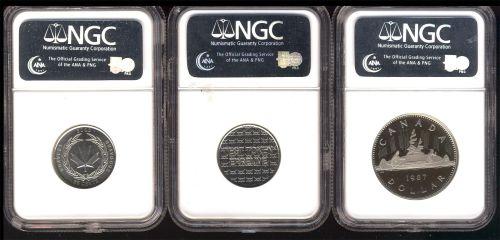 Lot of 3 NGC graded coins. 25 Cents; 2006 Bravery MS66, 2004 Test Token Poppy SP68, Dollar; 1987 PF6