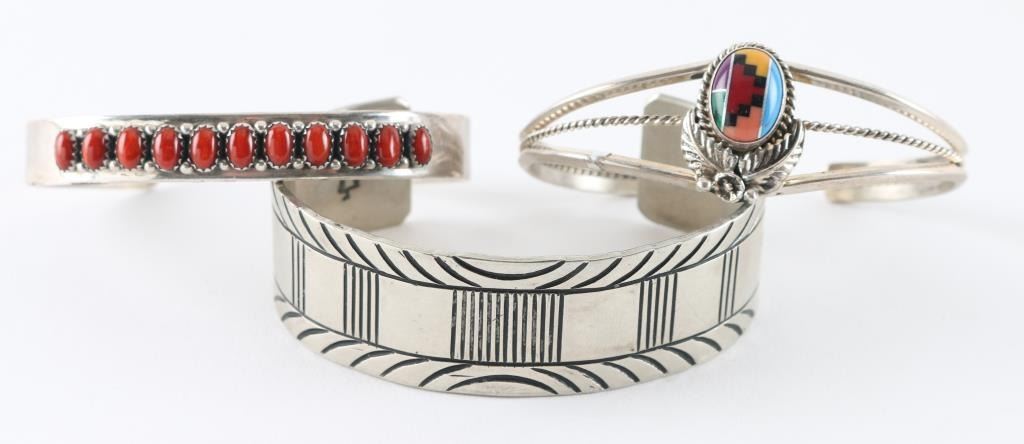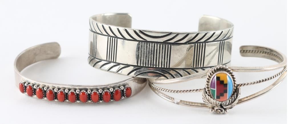 (1) Coral and sterling cuff (1) Zuni inlaid cuff (1) Plain sterling cuff unisex
