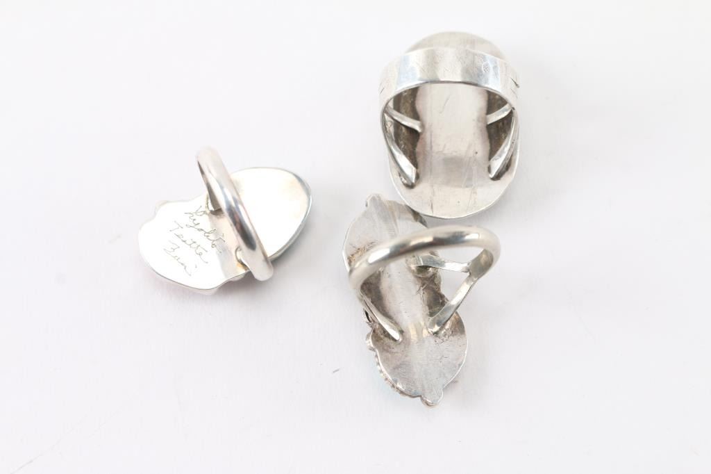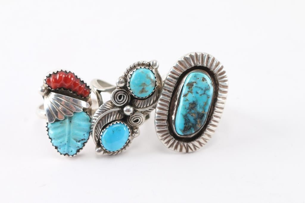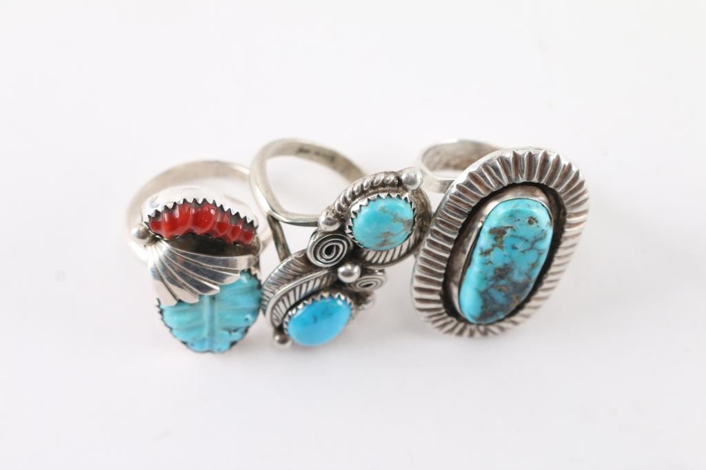 (1)Carved turquoise and coral ring set in sterling silver signed Loyalito Tsatte and zuni