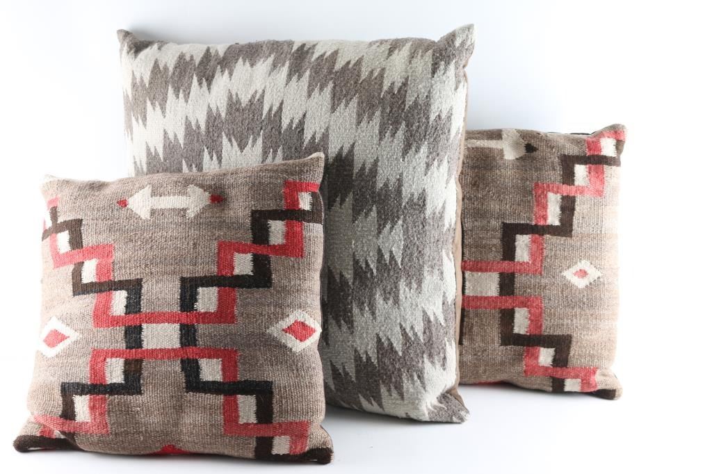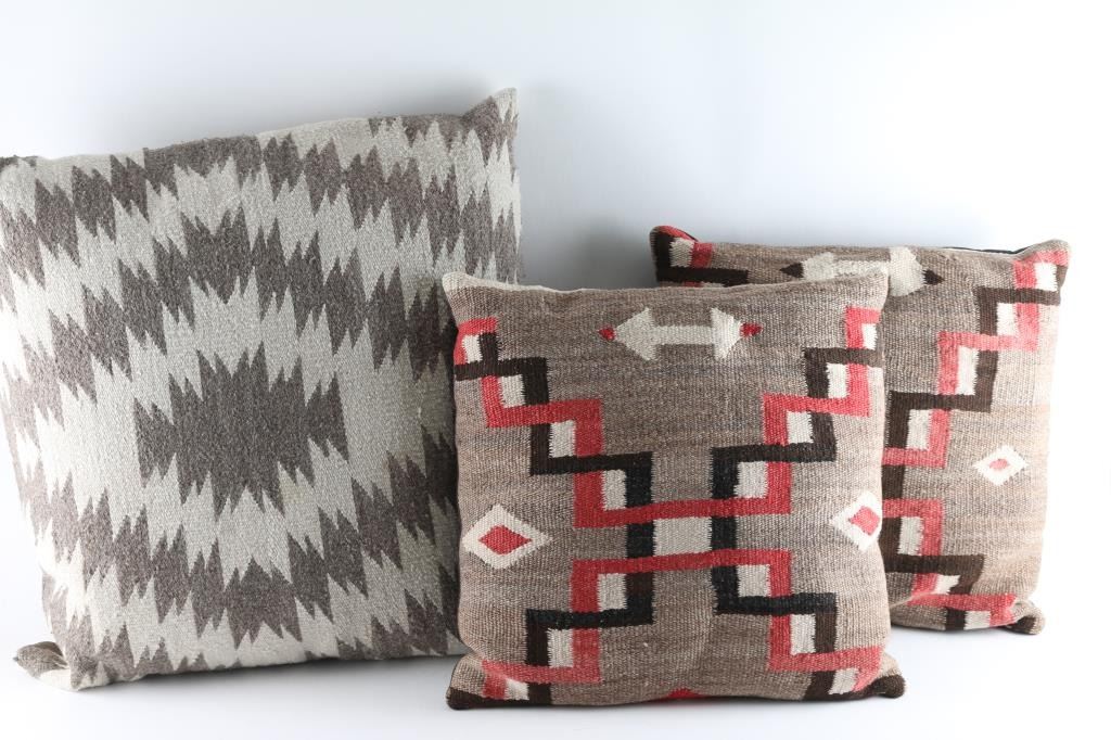 One larger pillow with gray and white geometric design measures 25"x22", red and black red mesa type rug measures 18"x18". Stunning decorators made from authentic rugs.