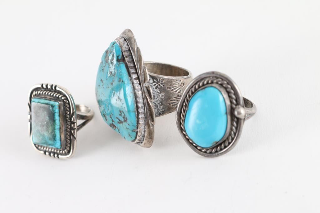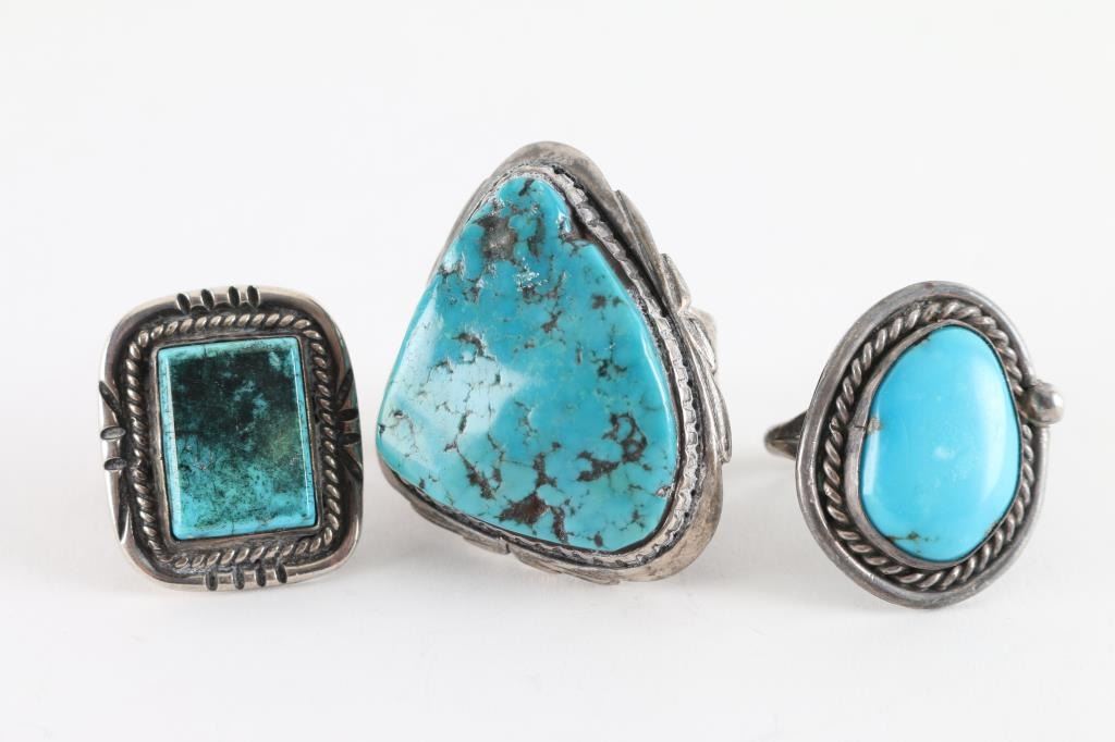 (1) Largest one is a size 10 (1) Square Cut turquoise ring size 7 maker marked L.Platero (1) Oval cut turquoise ring size 8 all sterling and Native made