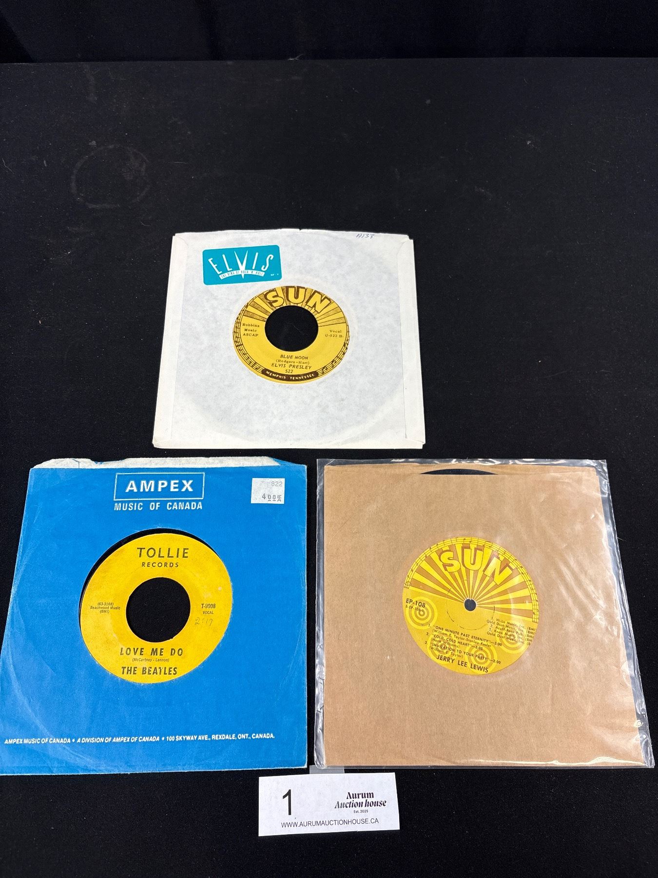 Lot of 3 Old 45 Records, Elvis Presely, The Beatles and Jerry Lee Lewis Sun Records