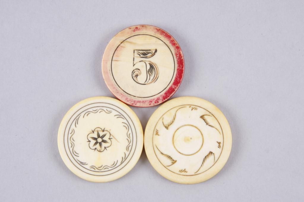 Lot of 3 Old West Ivory Cowboy Era Poker ChipsCirca Mid 1800s ONLY TO BE SOLD IN THE STATE OF ARIZONA BY LAW AND COMMERCE.