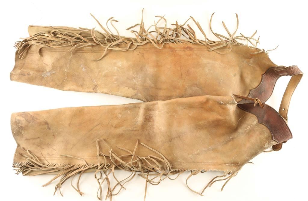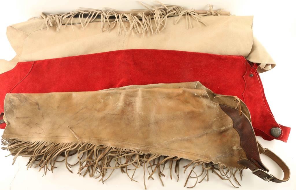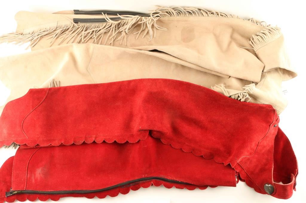 (1) pair mens chaps with fringe marked 'The Saddlery Bakersfield CA' show use, wear and stains and (2) pairs women's suede chaps, one red with scallops and one beige with fringe.