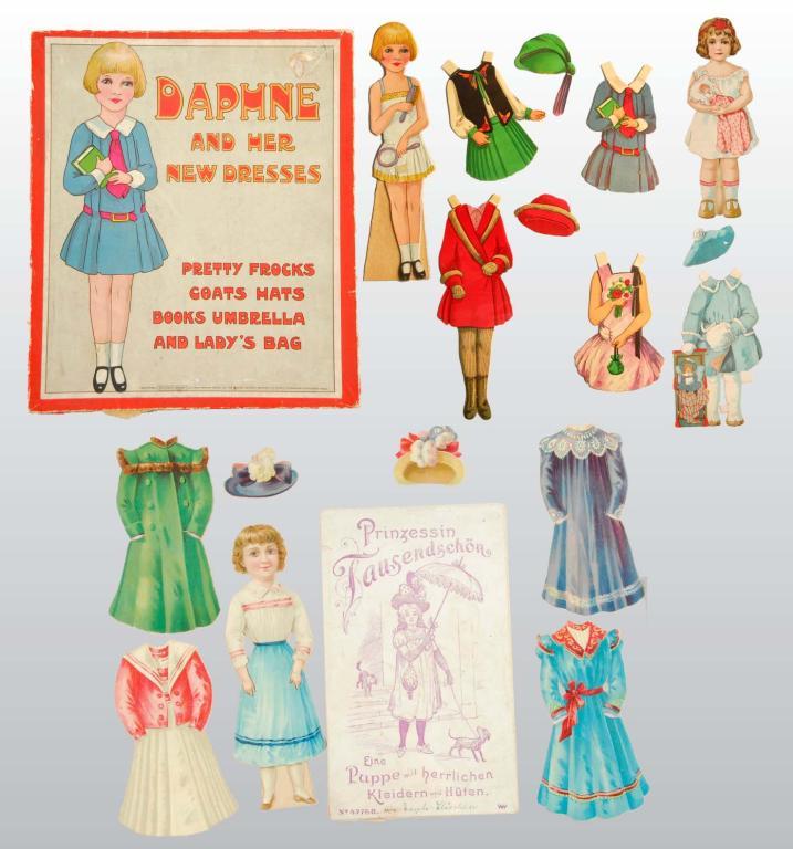Description ND. The "Prinzessin Tausendschon" set included one 7.5-inch easel-back doll with envelope, four outfits and two hats. The doll and clothing are embossed cardboard with bright colors and in excellent condition. Dated 1929. "Daphne and Her New Dresses" includes one 10.5-inch easel-back doll with four outfits and two hats. Condition is excellent. ND. An unnamed 11.25-inch doll in very good condition with three outfits and hats.