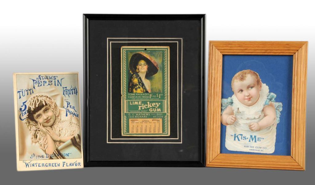 Description Includes one Adam's Pepsin Tuttie Fruttie trade card with some damage, one Kis-Me framed die-cut baby, and framed 1932 Lime Rickey Gum calendar beginning in April with some folding and tearing. Condition (Very Good - Excellent). Size Trade card: 4 - 1/2" x 6 - 3/4".