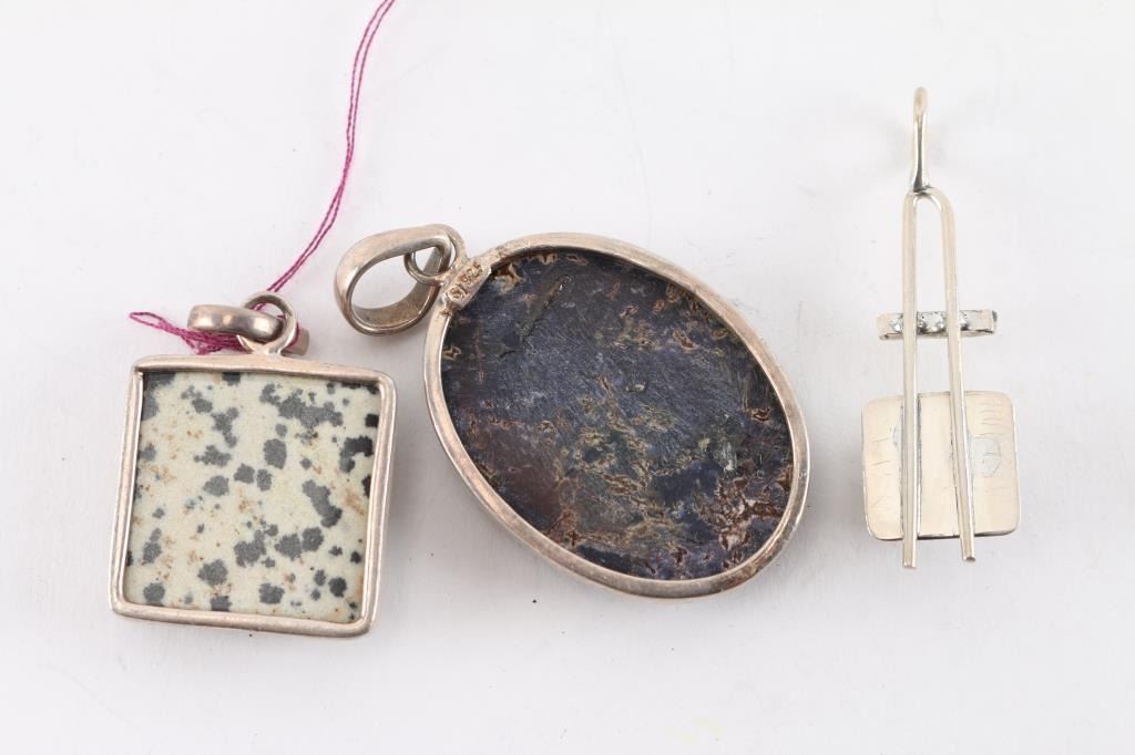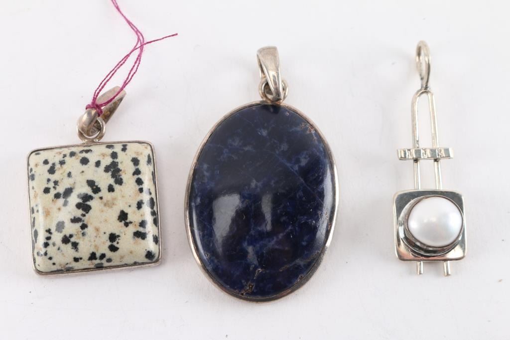 (1) Large oval blue sodalite stone in sterling silver. Measures 2". (1) Square dalmation jasper from North Carolina set in sterling silver, measures 1 1/2". (1) Charles Skiera ocean pearl pendant set in sterling silver, maker marked, measures 1 3/4".