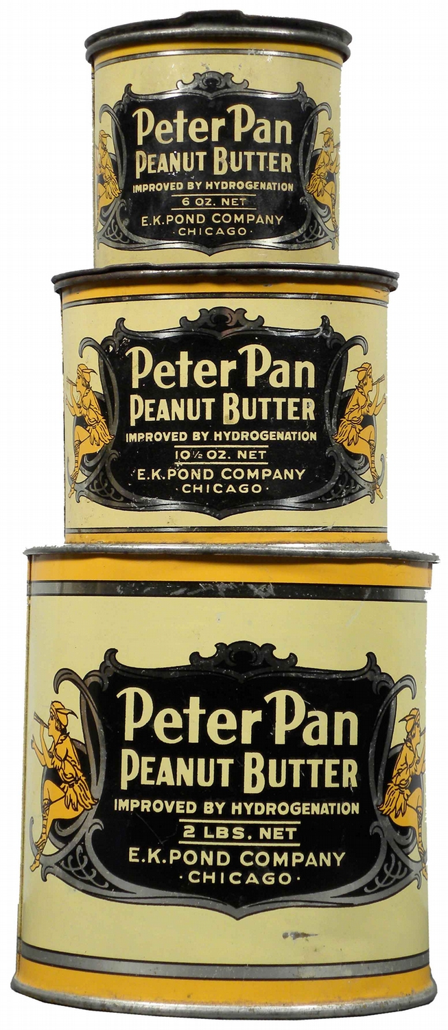 Lot of 3 Peter Pan Peanut Butter Pails. E.K. Pond Company, Chicago.6 oz, 10 1/2 oz and 2 lb sizes. Large tin missing lid otherwise excellent condition.