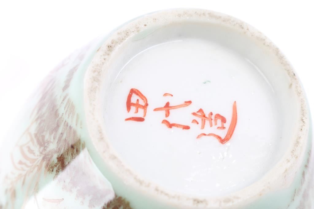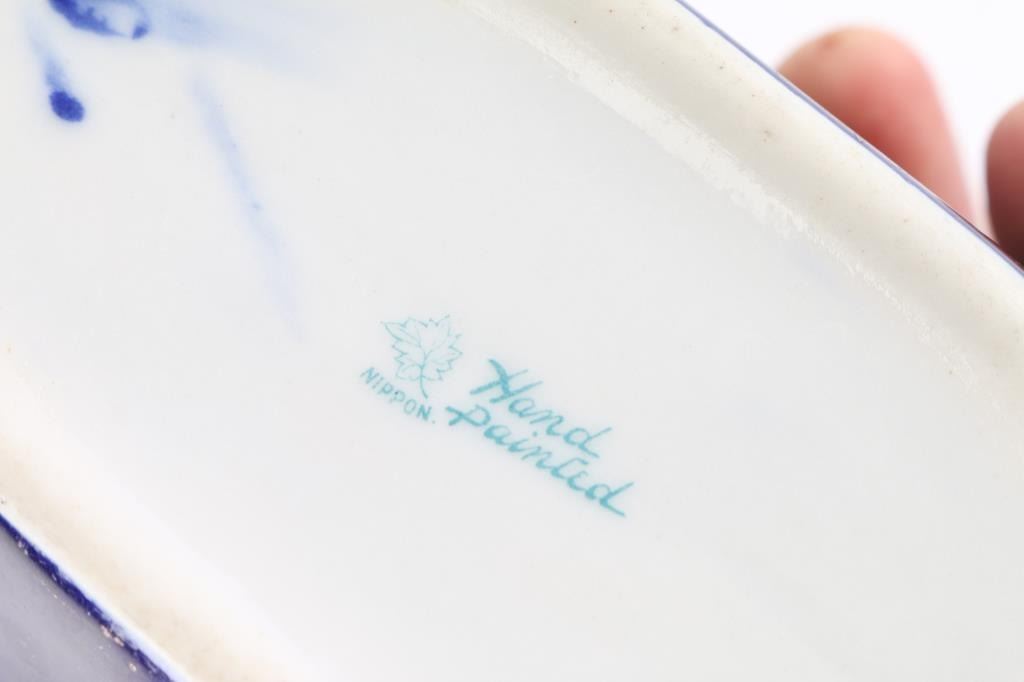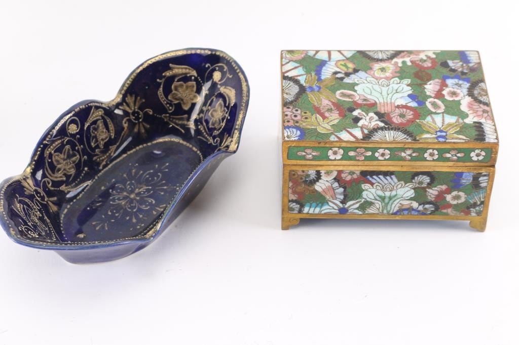 One is a Nippon dish in cobalt blue with hand-painted gold pattern, measures 7 1/2" long by 2" tall; one is a cloisonne and brass lidded box measuring 2 1/2" tall by 4 1/2" wide and 3 1/4" deep; and one is a Chinese jar measuring 5 1/2" tall by 4" wide.
