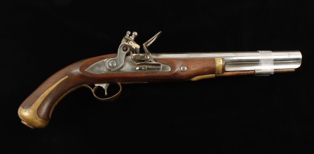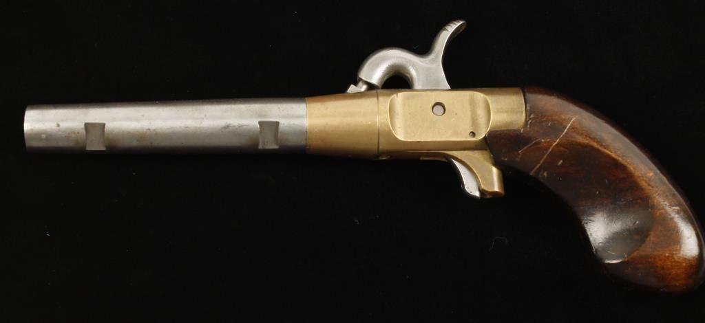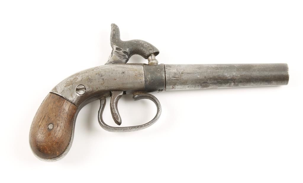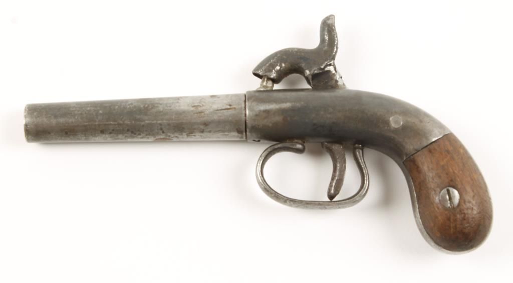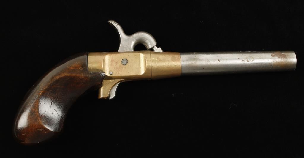 Unknown Percussion Pistol Cal .46 NVSN Probably modern manufactured center-hammered spur triggered single shot cap and ball pistol. Steel, Brass and wood construction. Steel barrel has rubs, scrapes and some surface rust spots. The dove tails for ram rod holders are approx. 120-125 degrees past top center of frame. Hammer and trigger show surface rust spots and possible pitting starting. Brass frame has tarnish and some rubs/scratches. Wood grip has dings, dents and scratches. Mechanically sound. Condition: Fair to good. *Antique Firearm* Belgian Flintlock Pistol Cal .56 NVSN Belgian made single barrel flintlock pistol. Probably modern manufacture. Steel, brass and wood. All steel parts are in the white and showing some little discoloration from rust. Brass trigger guard, grip cap, and trim is all tarnished. Wood has a few dings and rubs. Frizzen has strike marks from flint. Brass ramrod end has broken off. Mechanically sound. Condition: Good. *Antique Firearm* Unknown Percussion Pistol Cal .38 SN:72 Single shot center-hammered cap and ball pistol. Steel and wood construction. Steel shows wear to white in spots with pitting and some surface rust. There are wrench marks on the barrel from removal/tightening. Hammer may have been repaired/welded. with grinding to the repair. Trigger guard is loose. Action is loose and sloppy. Screw heads are buggered. Wood grips are worn with finish loss. Comes with a pistol rug/case. Condition: Poor to fair as antique. *Antique Firearm*