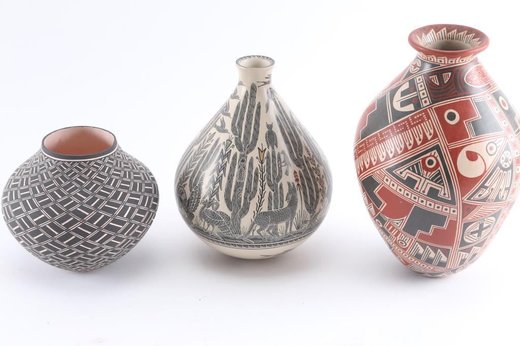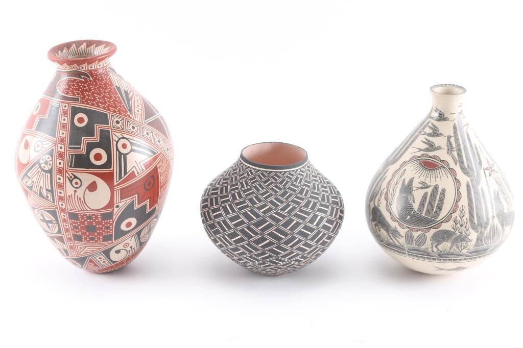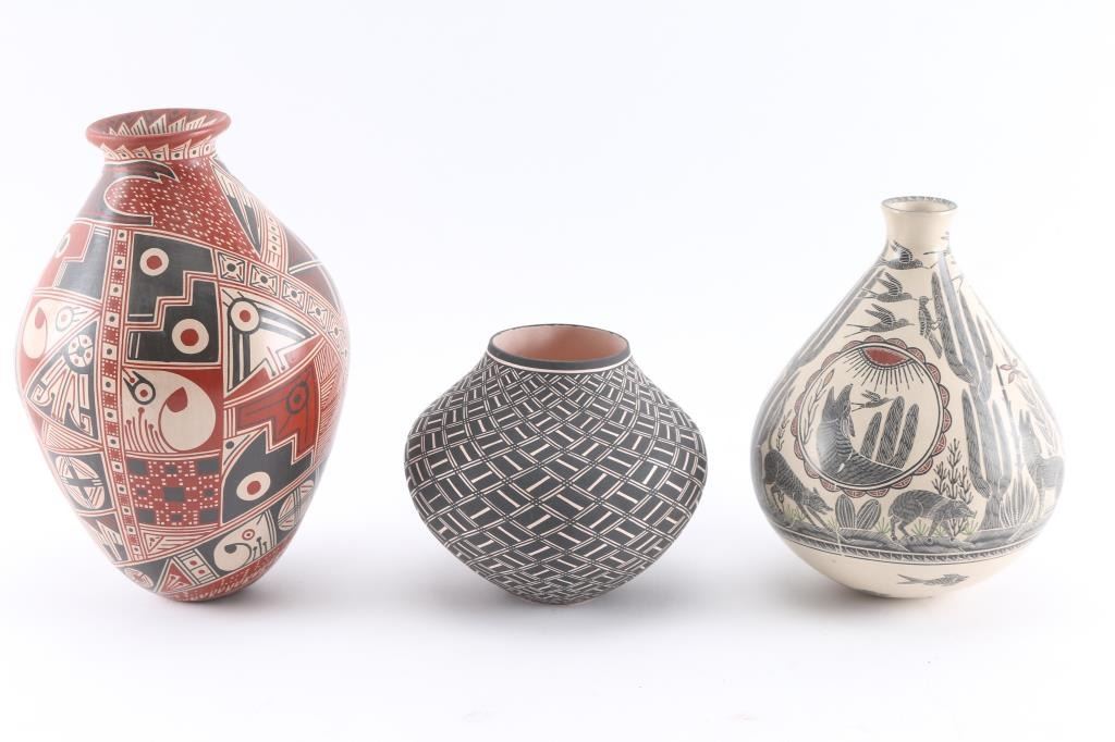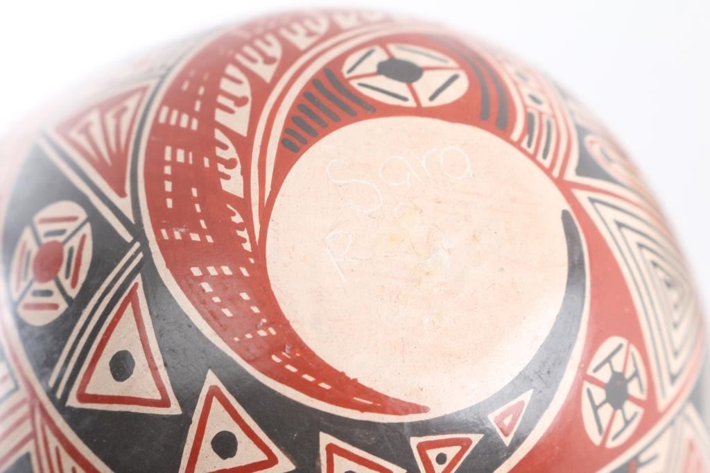 (1) largest Totone geometric painted pot signe Sara on base measures 9"