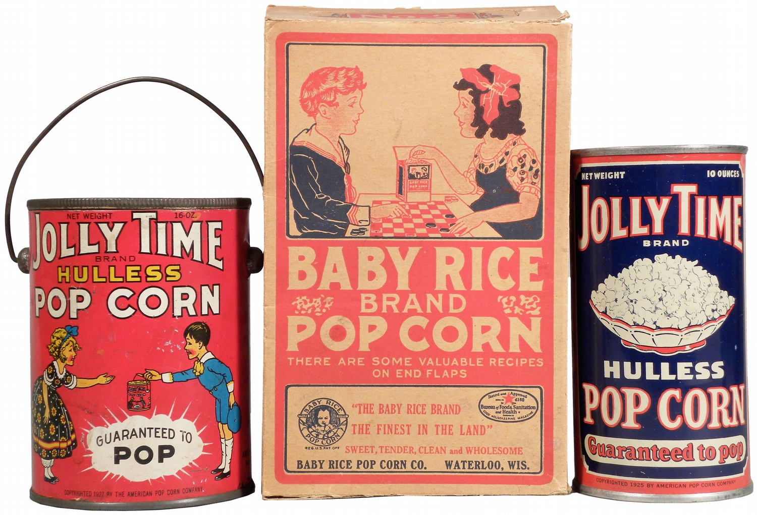Lot of 3 Pop Corn Containers. Jolly Time Hulless Tin Pail and Full Tin w/embossed lid. Baby Rice Brand Box. All in overall excellent condition. Box measures 4 1/2 X 7 X 2 1/4 inches.