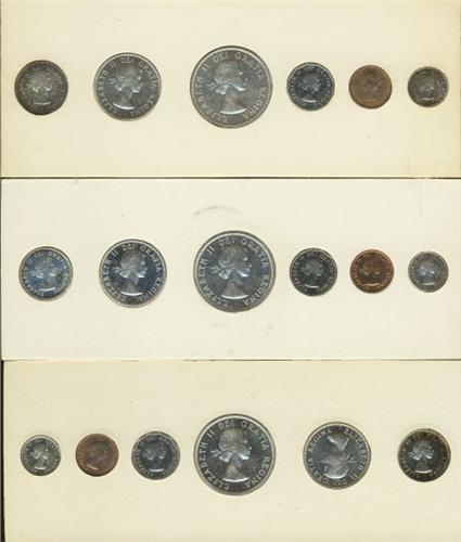 Lot of 3 Proof-like sets; 1959 in original white cards with broken cello. Silver coins are lightly toned.