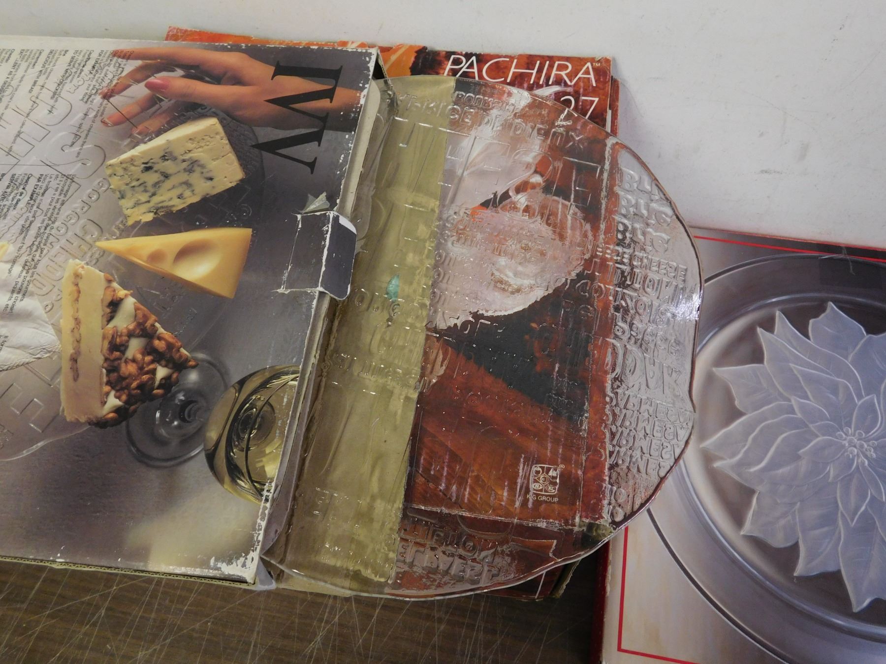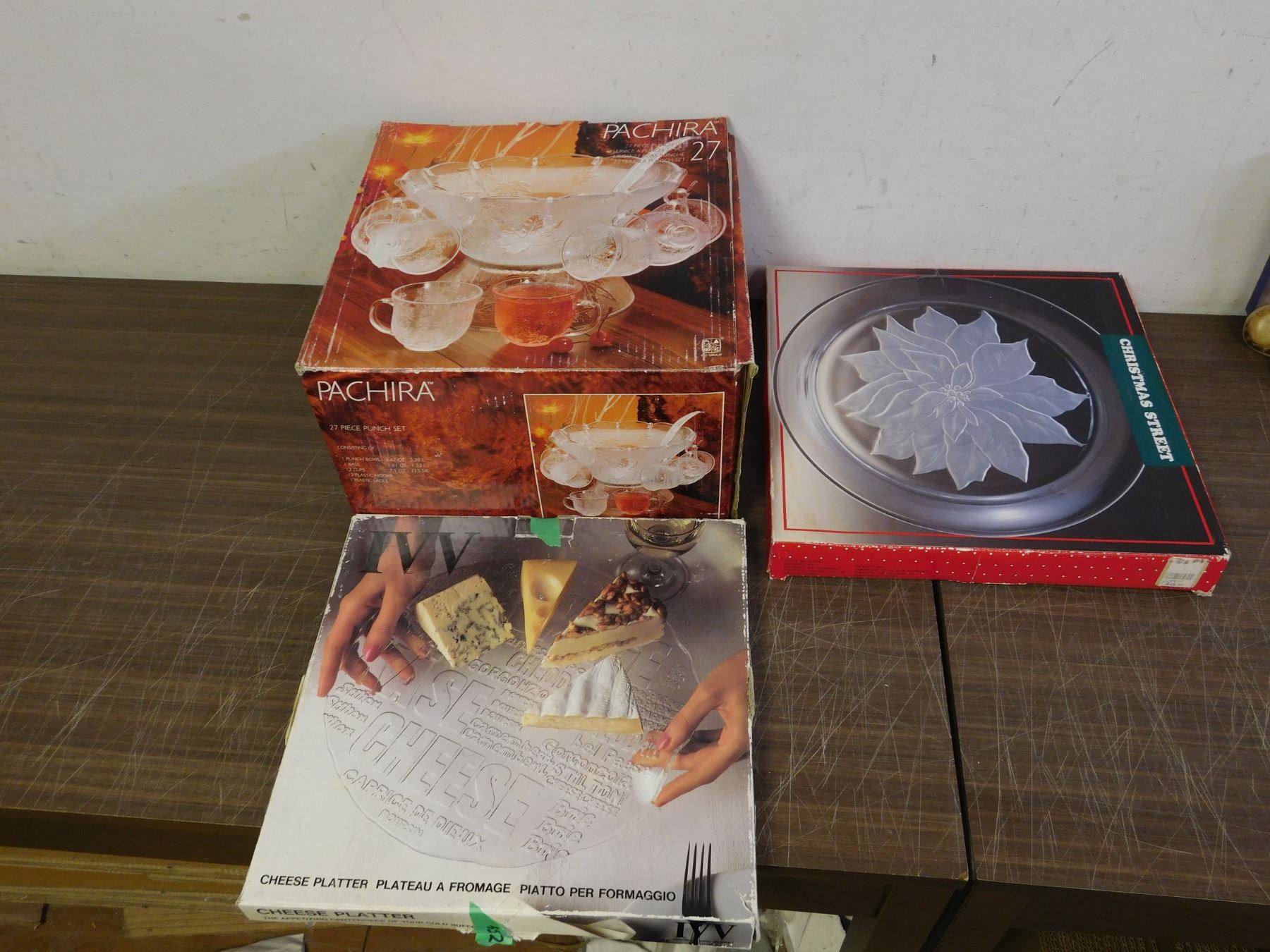 Lot of 3 Punch Bowl Set, Glass Cheese Board & Christmas Platter