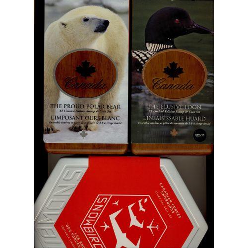 Lot of 3 RCM coin with stamp in a box, 2004 Elusive Loon, 2005 Proud Polar Bear $2 and 2006 Snowbirds $5,