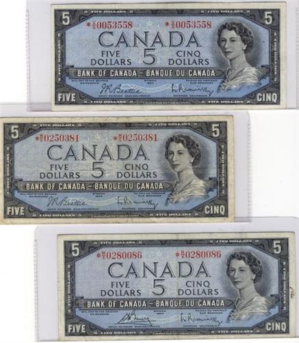 Lot of 3 "REPLACEMENT" 1954 $5 notes. Includes *RX, *WS, *VS. Grades vary from Fine to EF.