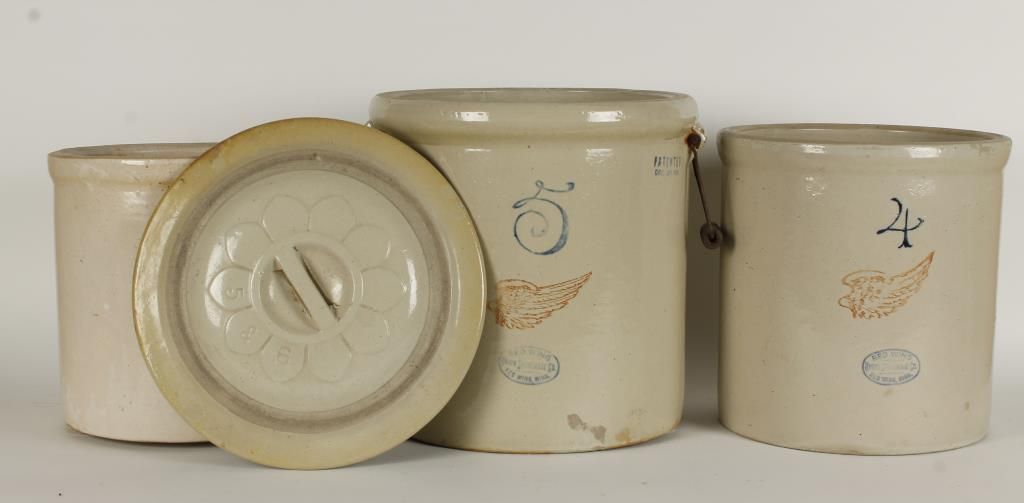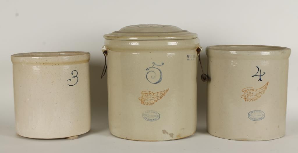 (1) Marked "Red Wing Union Stoneware Co, Redwing, Minn". Also with image of wing and marked 4. Approx 12" high x 11-1/2" diameter. (1) Marked "Red Wing Union Stoneware Co, Redwing, Minn". Also with image of wing and marked 5. Pat date 1915. With lid and handles. Approx 13-1/4" tall with out lid and 13" diameter. (1) Marked 3. Approx 10-1/2" tall x 10-1/2" diameter.