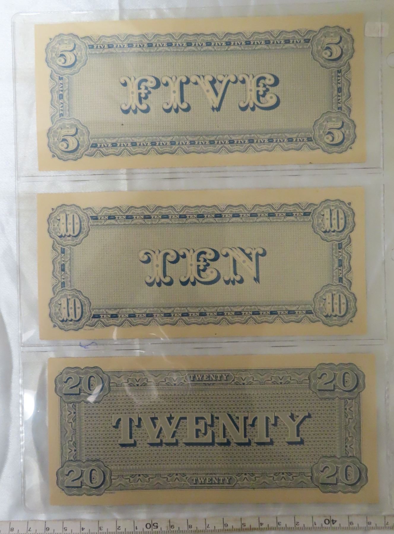 Lot of 3 Replica Confederate States of America notes. Includes $5, $10 & $20. None of these notes are real. Unc.