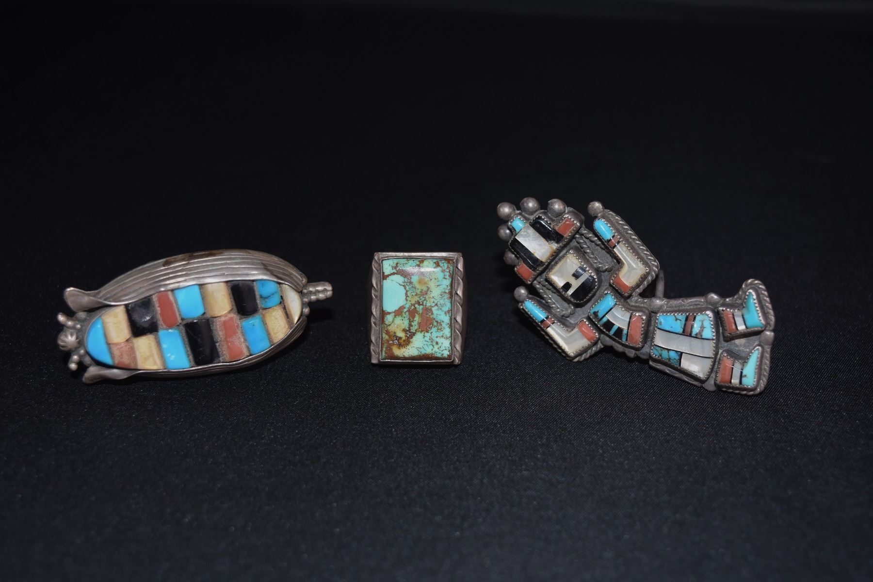 Lot of 3 Rings: 1) Zuni Inlay Rainbow Man Ring, 2) Corn Ring Marked "ML", 3) Navajo Silver & Rectang