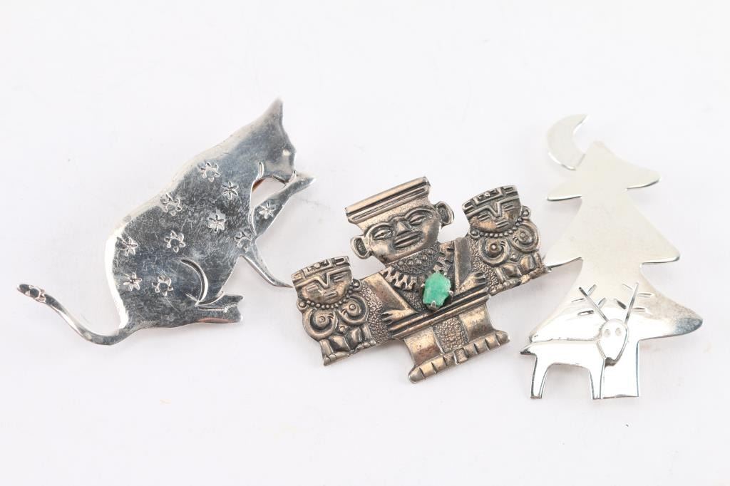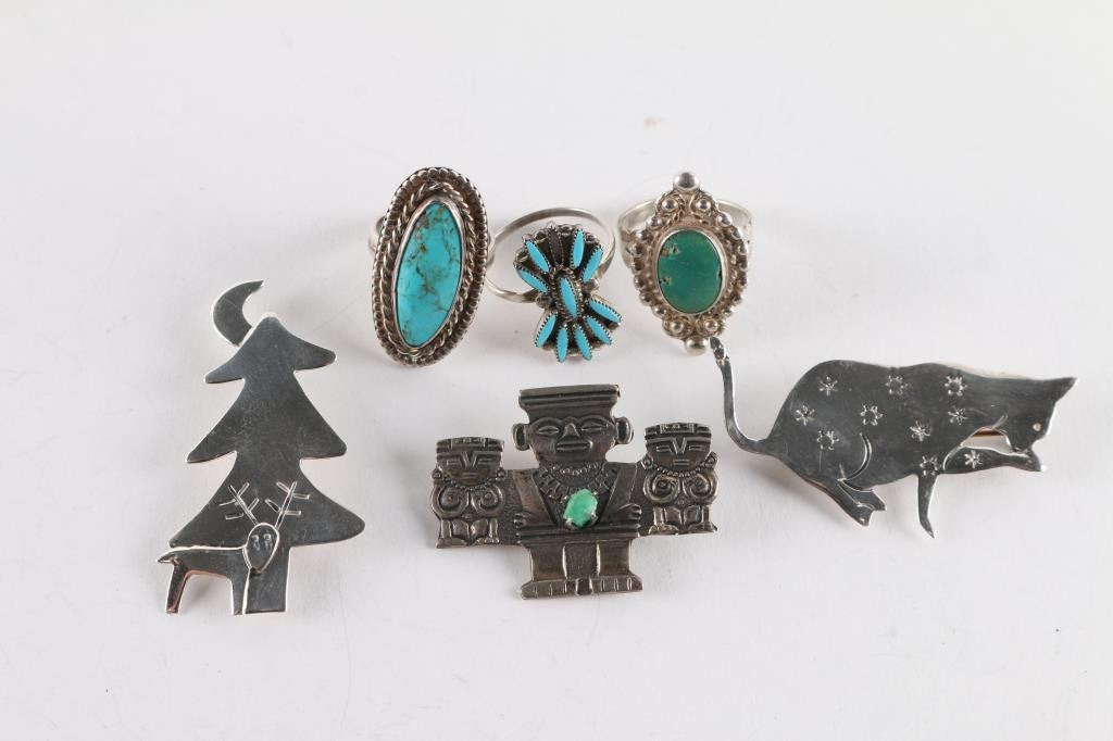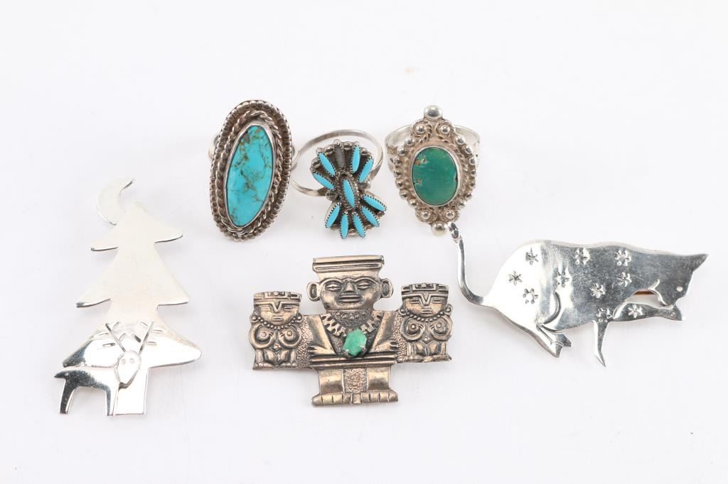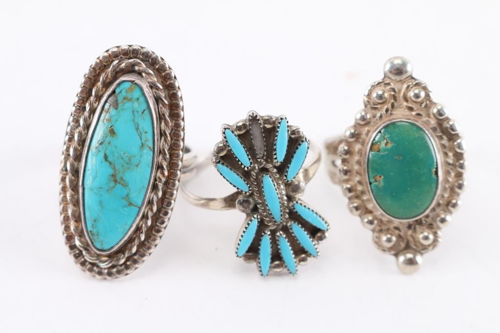 (3) Turquoise rings, sizes 5 3/4, 7, 8 1/4.(3) Pins, one can be a pendant as well.