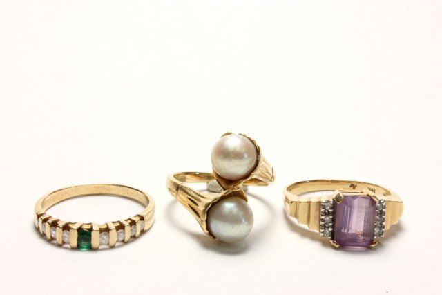 (1) 14k Gold & Pearl, (1) 14k Gold & Diamond with Peridot, (1) 14k Gold with Amethyst & Diamonds. Total weight approx 5.4 dwt.