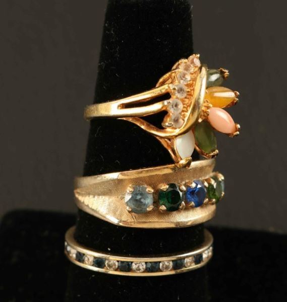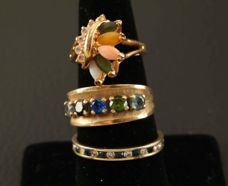 All set in gold metal, thin band set with green and clear sparkling stones size 10, band set with blue and green sparkling stones size 7 1/2, and ring with multicolored stones in swirled pattern size 5.