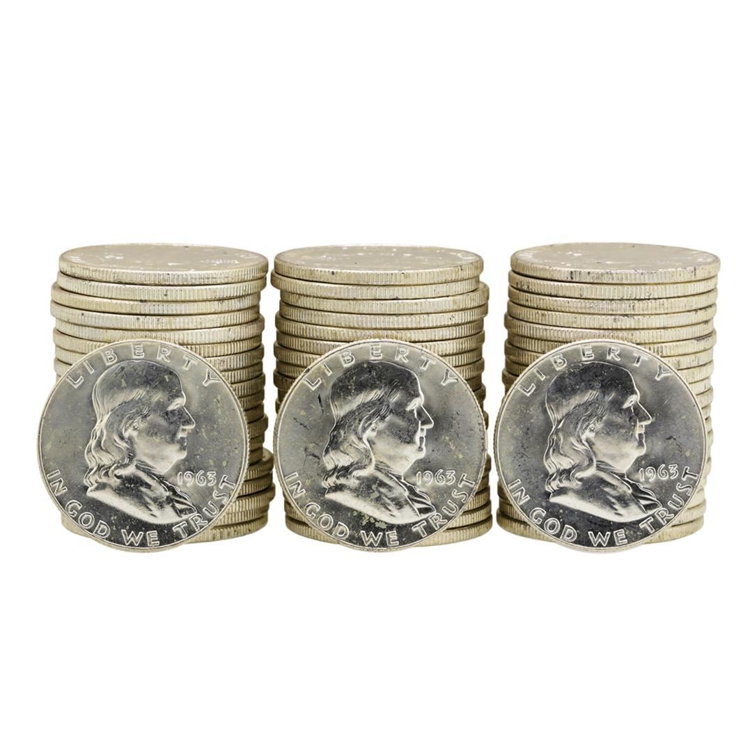 One Lot of (3) Rolls of (20) 1963-D Brilliant Uncirculated Franklin Half Dollars.