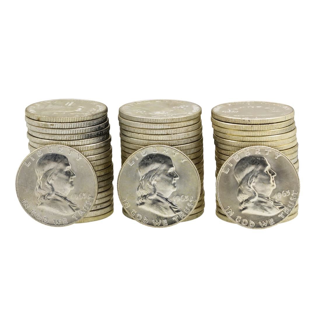 One Lot of (3) Rolls of (20) 1963-D Brilliant Uncirculated Franklin Half Dollars.